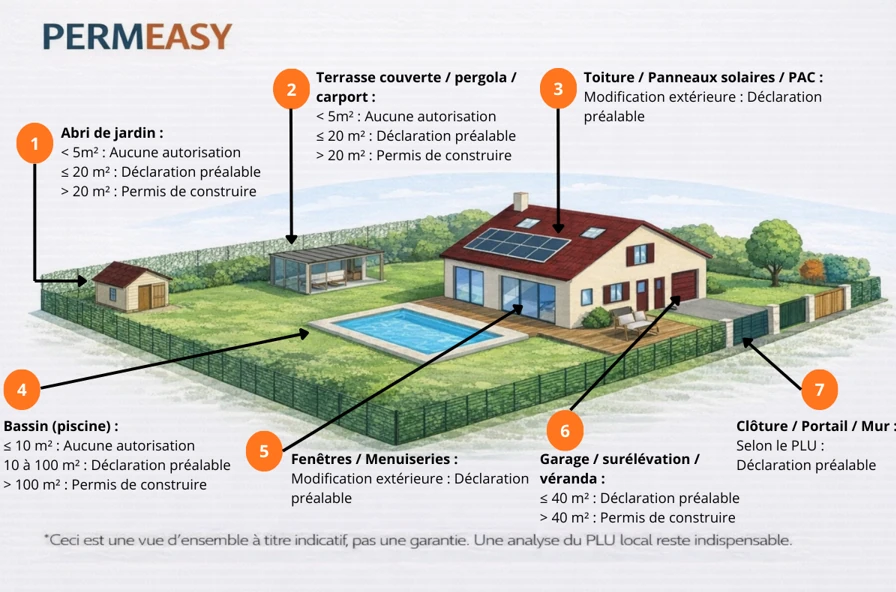 Ce simulateur détermine automatiquement les démarches d’urbanisme nécessaires selon la nature de votre projet et la surface créée. En quelques secondes, il vous indique si vos travaux nécessitent une déclaration préalable, un permis de construire, ou aucune formalité. Il vous suffit de choisir le type de projet et la surface concernée pour obtenir la réponse adaptée à votre situation.