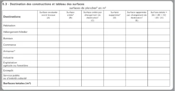 La surface de plancher peut être déclarée dans le formulaire de la demande d’autorisation de construire. Il convient ainsi de renseigner le cadre « Destination des constructions et tableau des surfaces ».