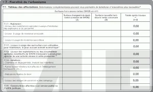 Mise à jour : le cadre « 7 – Fiscalité de l’urbanisme » a été supprimé des formulaires d’autorisation de construire. Désormais, il convient de renseigner un nouveau formulaire « Déclaration des éléments nécessaires au calcul des impositions ». Ce formulaire permet essentiellement d’y inscrire la surface taxable prévue par le projet ainsi que les installations ou équipements taxés forfaitairement au titre du code de l’urbanisme (notamment : espace de stationnement, piscine, éolienne, panneaux photovoltaïques au sol).
